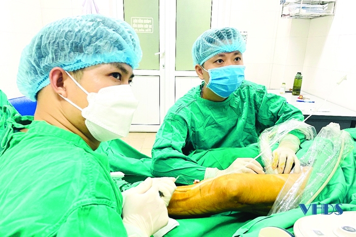 BS Nguyễn Văn Ngọc (phải) trong một ca can thiệp điều trị suy giãn tĩnh mạch.
