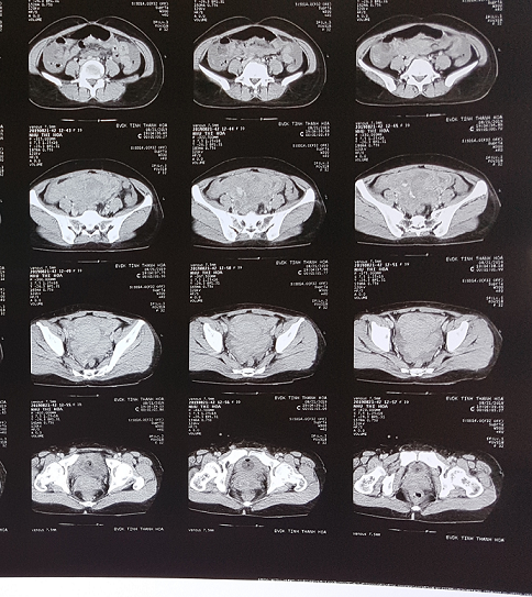 Kết quả chụp CT lồng ngực không thấy u cục gì, chụp CT ổ bụng có nhiều dịch máu trong ổ bụng, khối tổn thương ổ bụng vùng hạ vị lệch phải nghi ngờ là chửa ngoài tử cung, có hình ảnh thoát thuốc.