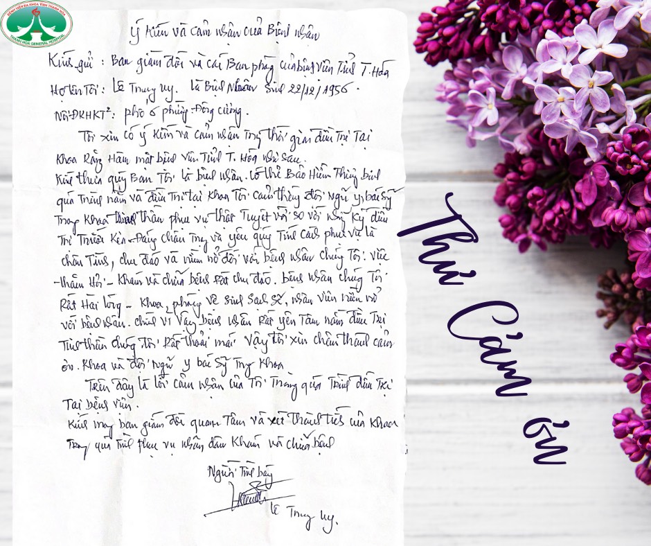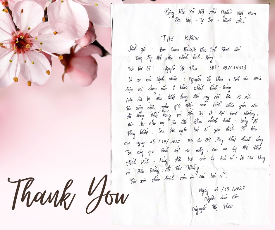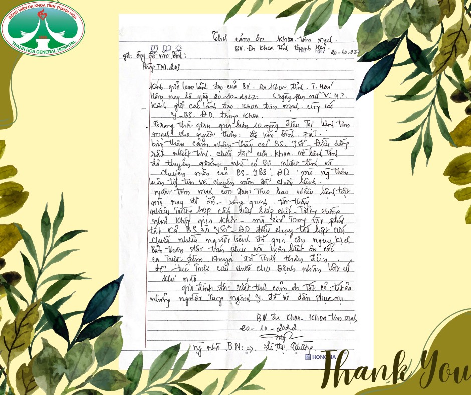 Thành quả cho sự nỗ lực, cố gắng đó của đội ngũ các y, bác sĩ Bệnh viện là được đón nhận những tình cảm trân quý hay những lời tri ân chân thành từ người bệnh, người nhà người bệnh. Tình cảm trân quý đó được bày tỏ qua những lá thư tay cảm ơn mộc mạc nhưng vô cùng sâu sắc và ý nghĩa, gửi trọn tâm tình của bệnh nhân và gia đình người bệnh.