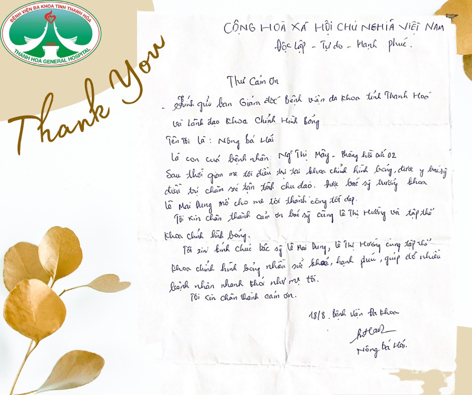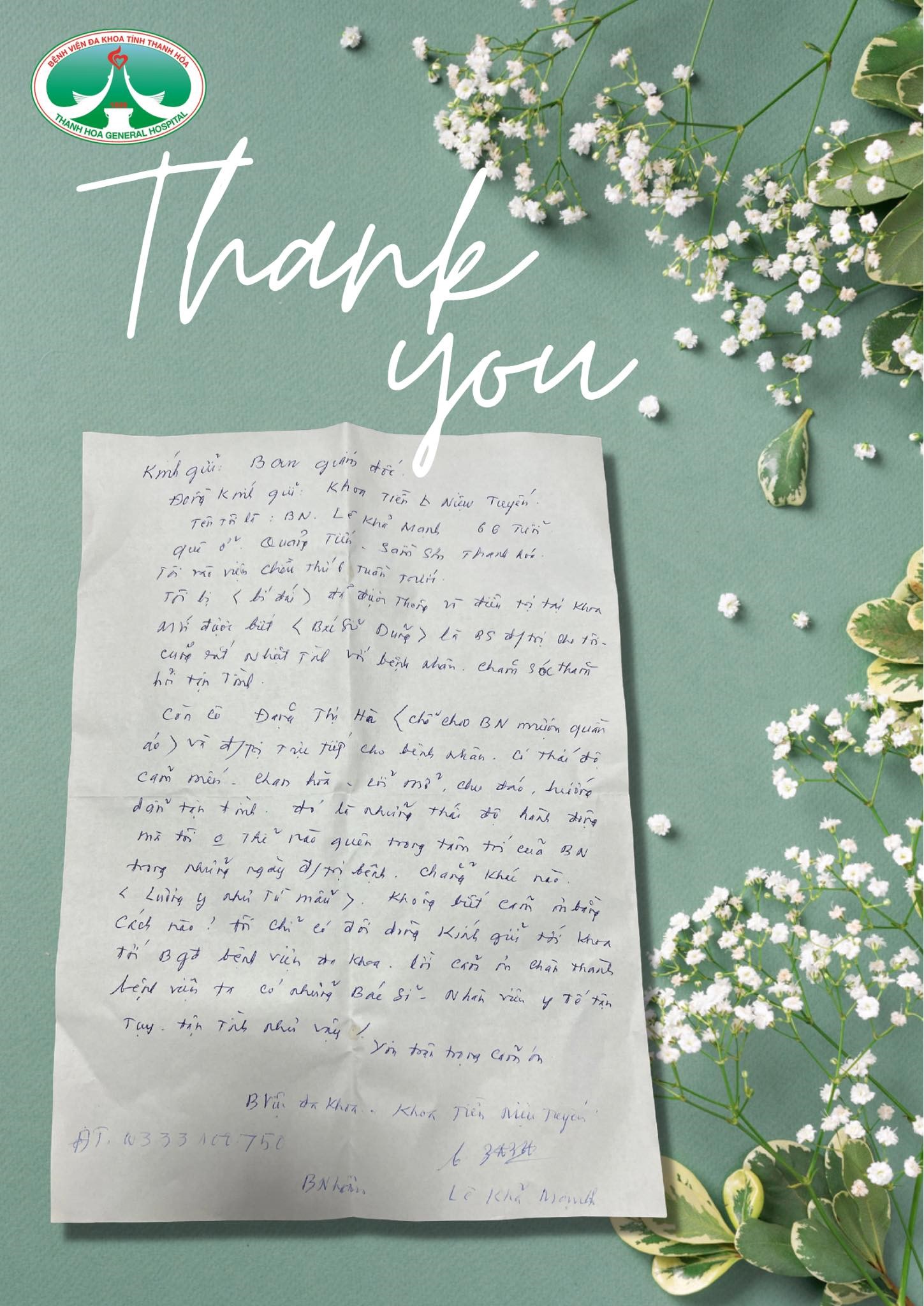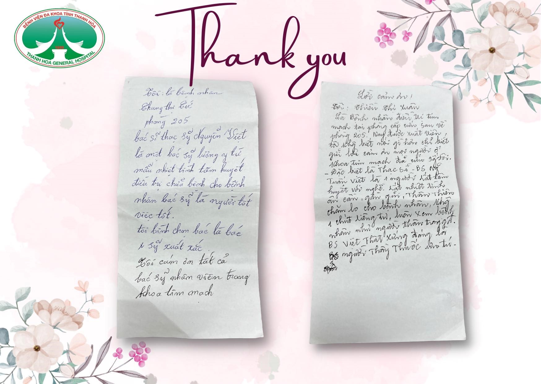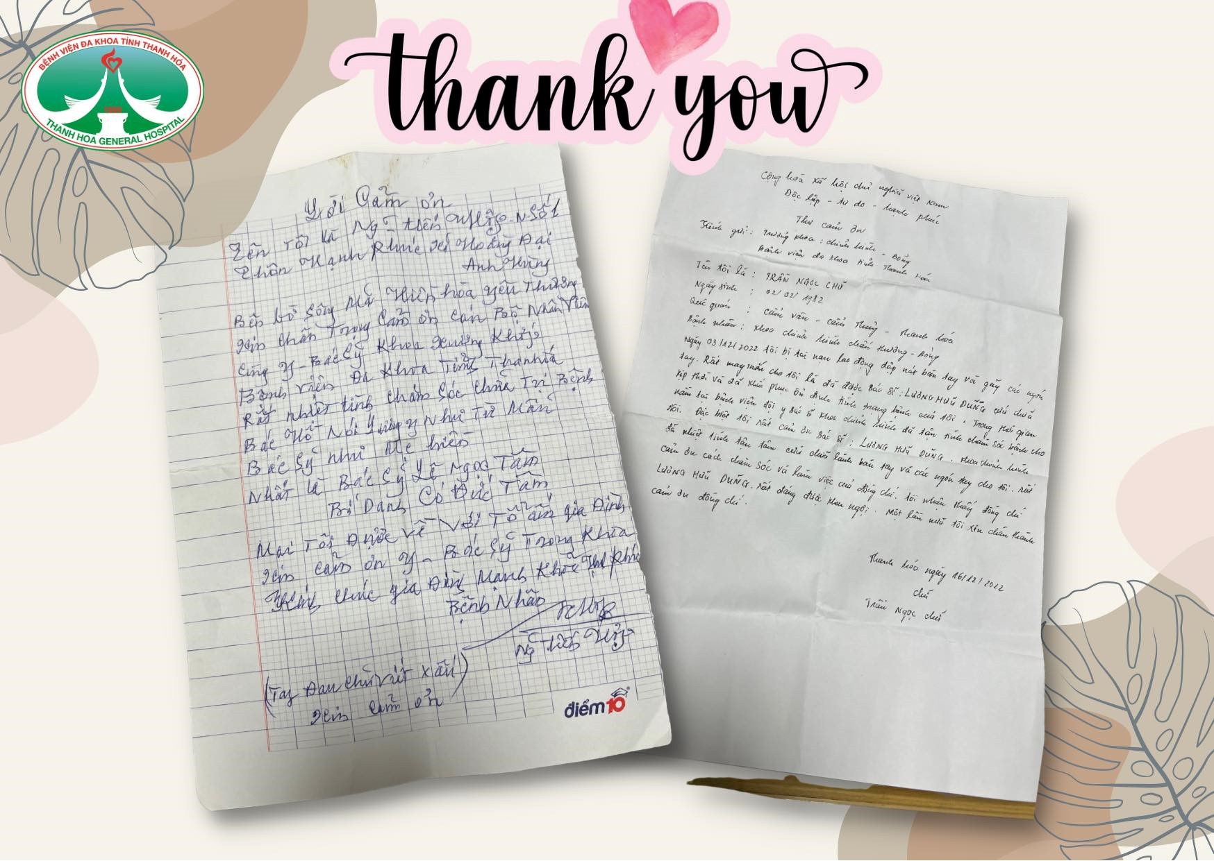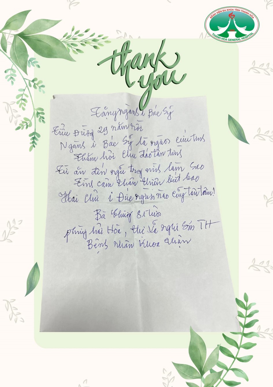 Thành quả cho sự nỗ lực, cố gắng đó của đội ngũ các y, bác sĩ Bệnh viện là được đón nhận những tình cảm trân quý hay những lời tri ân chân thành từ người bệnh, người nhà người bệnh. Tình cảm trân quý đó được bày tỏ qua những lá thư tay cảm ơn mộc mạc nhưng vô cùng sâu sắc và ý nghĩa, gửi trọn tâm tình của bệnh nhân và gia đình người bệnh.