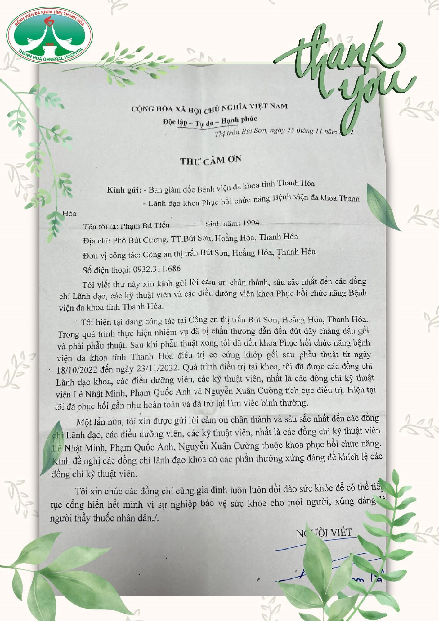 Bệnh viện Đa khoa tỉnh Thanh Hóa xin gửi lời cảm ơn sâu sắc đến quý bệnh nhân, thân nhân và nhân dân đã đồng hành và đặt trọn niềm tin vào đội ngũ y bác sỹ của Bệnh viện.