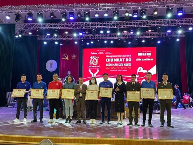 BSCKI Nguyễn Văn Tam (đứng thứ 2 từ bên trái sang) nhận Giấy khen của Ban chỉ đạo Vận động hiến máu tình nguyện tỉnh Thanh Hóa