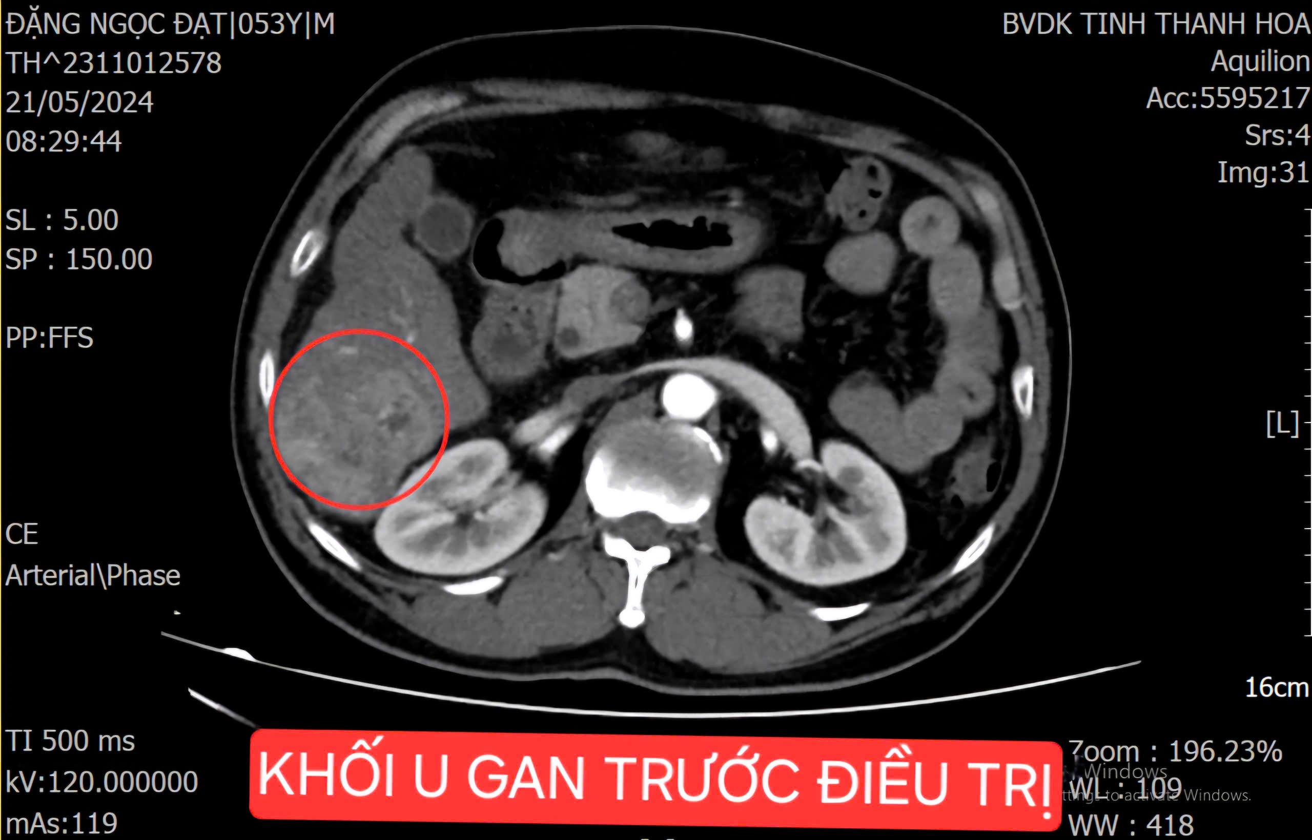 Bệnh nhân Đ.N.Đ (54 tuổi, Đại Lộc, Hậu Lộc) nhập viện trong tình trạng đau vùng hạ sườn phải kéo dài, dù đã điều trị tại các bệnh viện tuyến trung ương nhưng không mang lại hiệu quả. Sau quá trình thăm khám, làm các xét nghiệm chuyên sâu, bệnh nhân được chẩn đoán mắc ung thư biểu mô tế bào gan (HCC) giai đoạn cuối, có huyết khối tĩnh mạch cửa nhánh phải trên nền xơ gan, với khối u có kích thước lên tới 75x34mm.