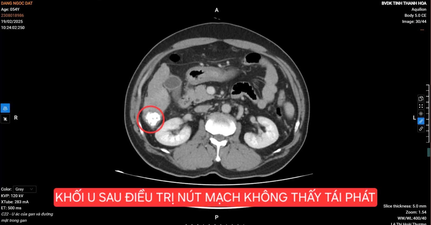 Sau can thiệp nút mạch, bệnh nhân được theo dõi sát sao. Và điều bất ngờ là chỉ sau một lần điều trị nút mạch, sau 9 tháng theo dõi, bệnh nhân tái khám với kết quả: Khối u không còn dấu hiệu tái phát, chỉ số marker ung thư gan (AFP) giảm thấp đáng kể, chỉ còn 8,25 ng/mL.