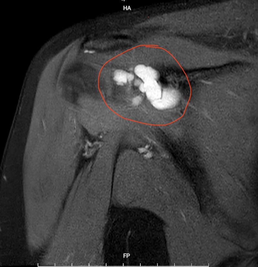 Qua thăm khám lâm sàng kết hợp chẩn đoán hình ảnh, các bác sĩ chẩn đoán bệnh nhân mắc u bao hoạt dịch khớp vai phải – một bệnh lý hiếm gặp. Kết quả chụp cộng hưởng từ (MRI) cho thấy khối u kích thước khoảng 4×2 cm gây hẹp khoang mỏm cùng vai, chèn ép các cấu trúc xung quanh.