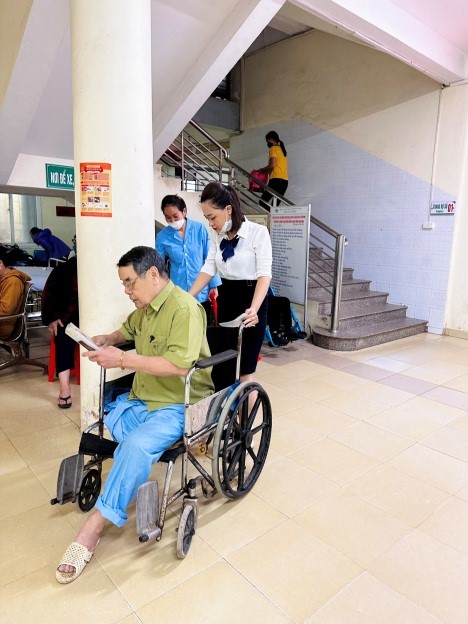 Hỗ trợ bệnh nhân có tổn thương chân di chuyển khám bệnh bằng xe lăn.