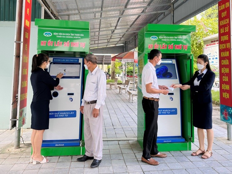 Hỗ trợ bệnh nhân tại Kioks lấy số thứ tự khám