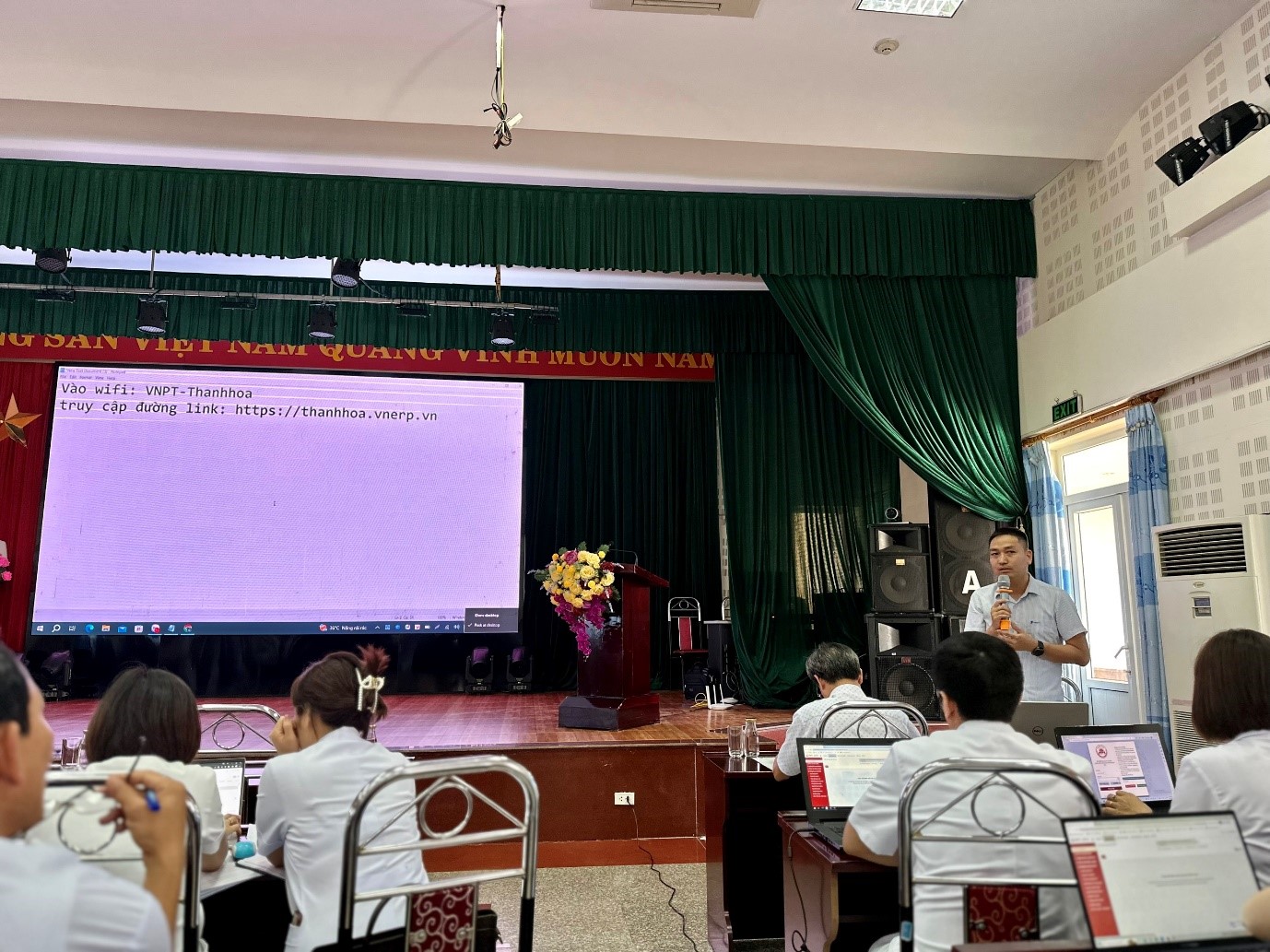 Tại lớp tập huấn, các học viên đã được chuyên viên của Viễn thông Thanh Hoá VNPT hướng dẫn đăng nhập hệ thống Cập nhật cơ sở dữ liệu về cán bộ viên chức trong các cơ quan nhà nước tỉnh Thanh Hóa năm 2023 để cập nhật, số hóa thông tin, quản lý cơ sở dữ liệu cán bộ, viên chức trong Bệnh viện đảm bảo đồng bộ, thống nhất, quản lý chặt chẽ theo quy định của Bộ Nội vụ và hướng dẫn quản trị hệ thống, khai thác sử dụng phần mềm cho đội ngũ kỹ thuật viên, chuyên viên làm công tác quản trị.