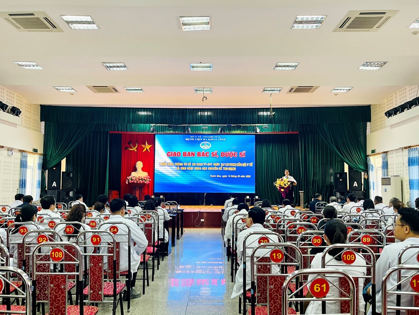 Chiều 16-02, Bệnh viện Đa khoa tỉnh Thanh Hóa tổ chức tập huấn triển khai Thông tư số 20/2022/TT-BYT ngày 31/12/2022 của Bộ Y tế về ban hành danh mục, tỷ lệ, điều kiện thanh toán đối với thuốc hoá dược, sinh phẩm, thuốc phóng xạ và chất đánh dấu thuộc phạm vi được hưởng của người tham gia bảo hiểm y tế và sinh hoạt khoa học chuyên đề Tim mạch. Tham dự buổi tập huấn có Ban Giám đốc Bệnh viện, Lãnh đạo các Khoa, Phòng, Trung tâm và gần 200 Bác sĩ và Dược sĩ trong Bệnh viện.