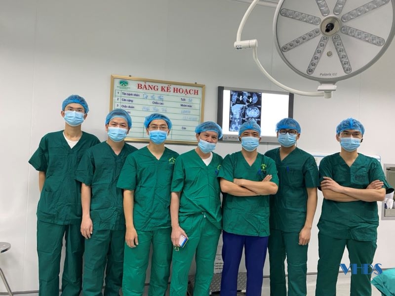 Bác sĩ Tùng (thứ 2 từ phải sang) thực hiện một ca phẫu thuật thận nội soi.