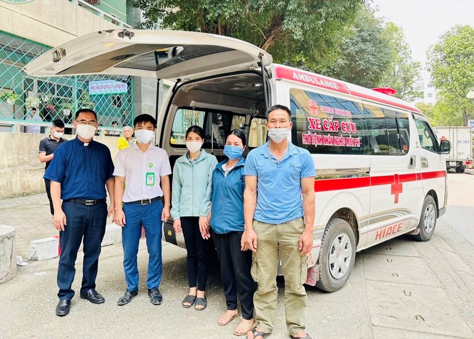 Cha Nguyễn Văn Thường (Đại diện Caritas Thanh Hóa), Đại diện phòng CTXH và người nhà bệnh nhân chuẩn bị đưa chị Bùi Thị S. lên xe