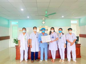 Ê kíp chăm sóc bệnh nhân sau ghép thận trao giấy ra viện cho bệnh nhân