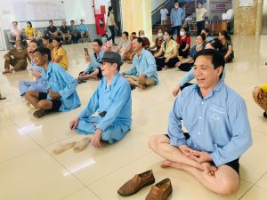 Chị Lê Thị Chi có mẹ chuẩn bị mổ u tuyến giáp, mới đến viện được 3 ngày. Đây là lần đầu tiên tôi được tập yoga cười, thấy tinh thần được thư giãn. Nhất là bài hoạt động cho mọi người đấm lưng, vỗ lưng, xoa lưng cho nhau, khi hô “vui vẻ, vui vẻ”, “thoải mái, thoải mái” và “sung sướng, sung sướng”, khiến tôi cảm thấy bớt lo âu”, chị Chi cười bẽn lẽn.
