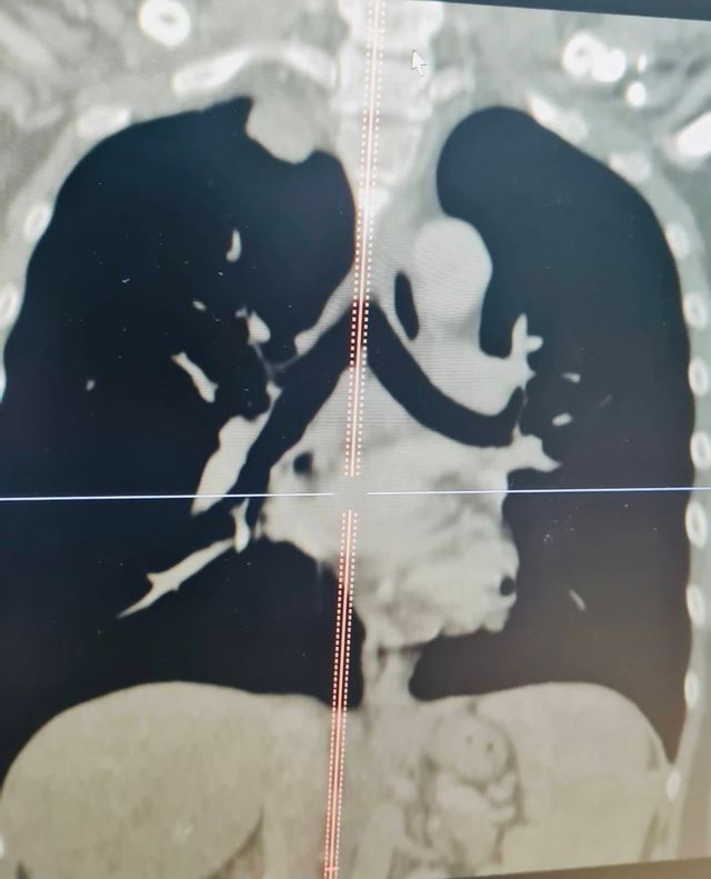 Các bác sĩ chẩn đoán bệnh nhân có khối u tuỷ sống và lồng ngực lớn hiếm gặp. Bệnh nhân cần được chỉ định phẫu thuật kịp thời để loại bỏ khối u nhằm giải phóng chèn ép tủy và chèn ép khoang trung thất.
